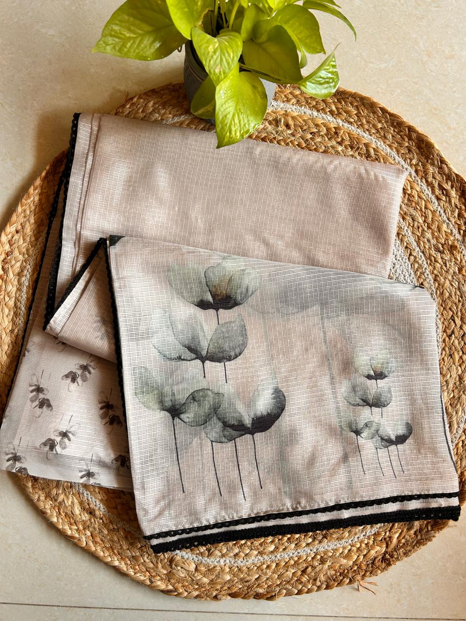 Ivory Jaal is a saree that celebrates understated elegance. Woven in a soft Kota Doriya blend, this piece features a delicate cream base adorned with green and black floral patterns that dance across the fabric. The lightweight, breathable weave makes it perfect for warm weather while maintaining the structure and drape that defines premium handcrafted textiles. This saree effortlessly transitions from day to evening. The sophisticated color palette and detailed floral design showcase traditional craftsmanship with a contemporary sensibility. Pair it with a contrasting blouse to highlight the Jaal work or keep it minimal to let the fabric speak for itself. A versatile addition to any saree collection, the Ivory Jaal combines comfort with timeless style.