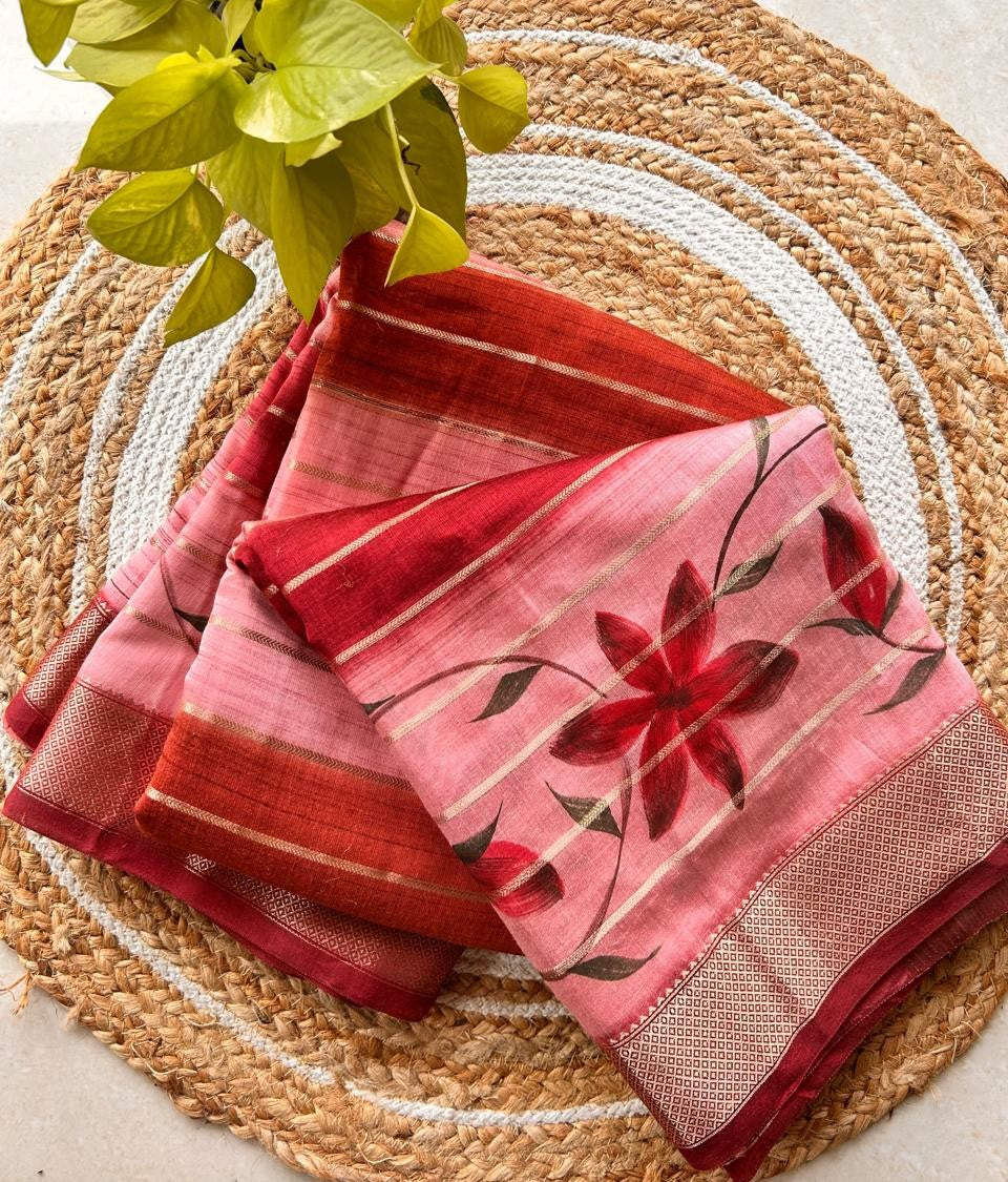 Introducing Ruby Dust, a stunning handcrafted saree featuring a captivating mix of rich pink, rust, and gold tones. This piece blends traditional artistry with contemporary sophistication, draping beautifully for celebrations, festive occasions, or everyday luxury.